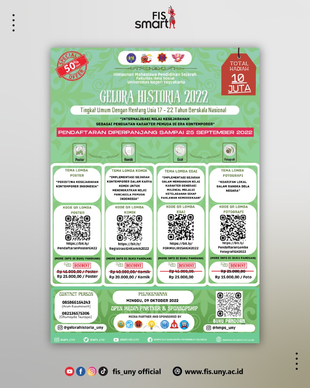 Gelora Historia merupakan sebuah kompetisi sejarah yang terdiri dari empat cabang lomba, yaitu lomba esai, lomba komik, lomba poster dan lomba fotografi tingkat nasional dengan sasaran mahasiswa dan umum dengan rentang usia 17-22 tahun. Pendaftarannya dibuka mulai 11 Agustus hingga 18 September 2022.